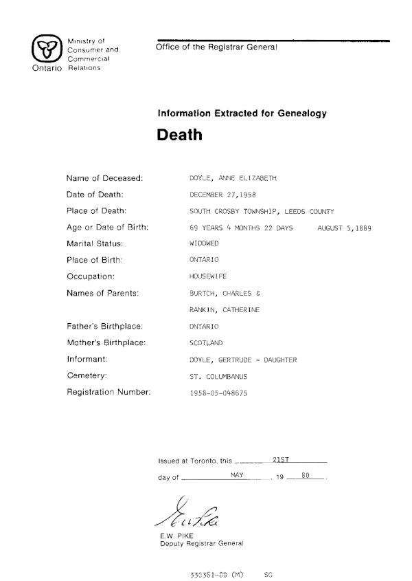 Ann Burtch Doyle death certificate